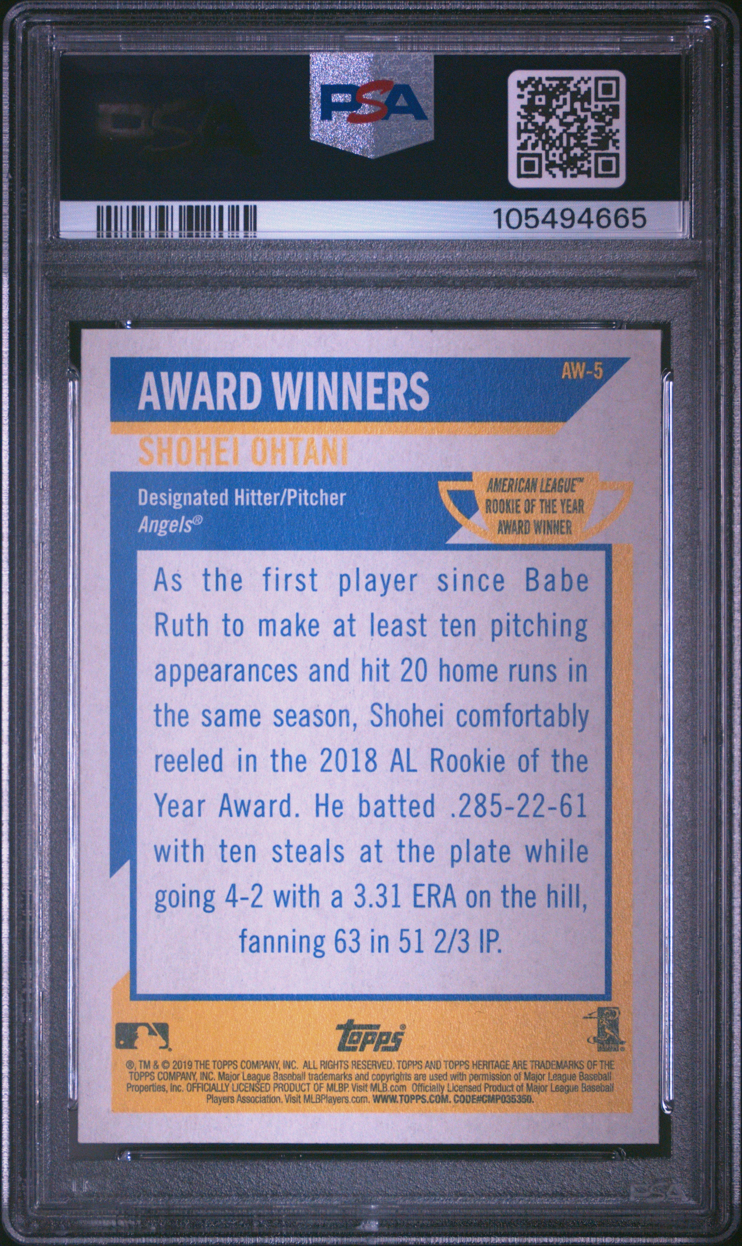 2019 Topps Heritage Shohei Ohtani #AW-5 Award Winners Rookie of the Year PSA 10 Gem Mint!