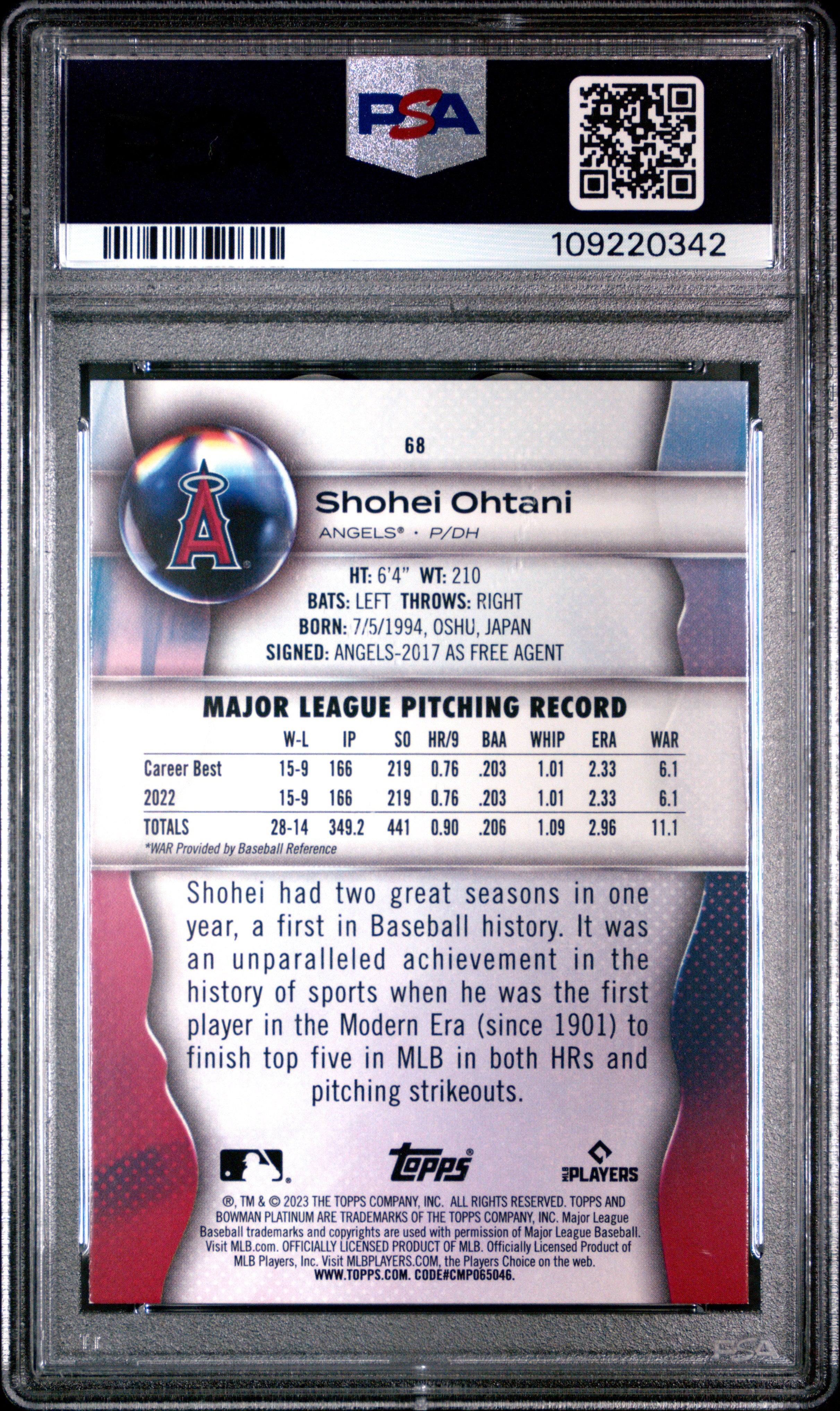 2023 BOWMAN PLATINUM SHOHEI OHTANI #68 ICE FOIL PARALLEL GRADED PSA 9 MINT RARE!