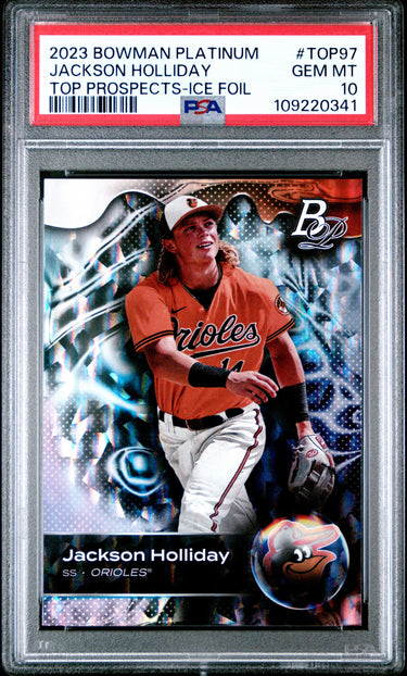 2023 BOWMAN PLATINUM JACKSON HOLLIDAY #TOP97 ICE FOIL PARALLEL PSA 10 GEM MINT!
