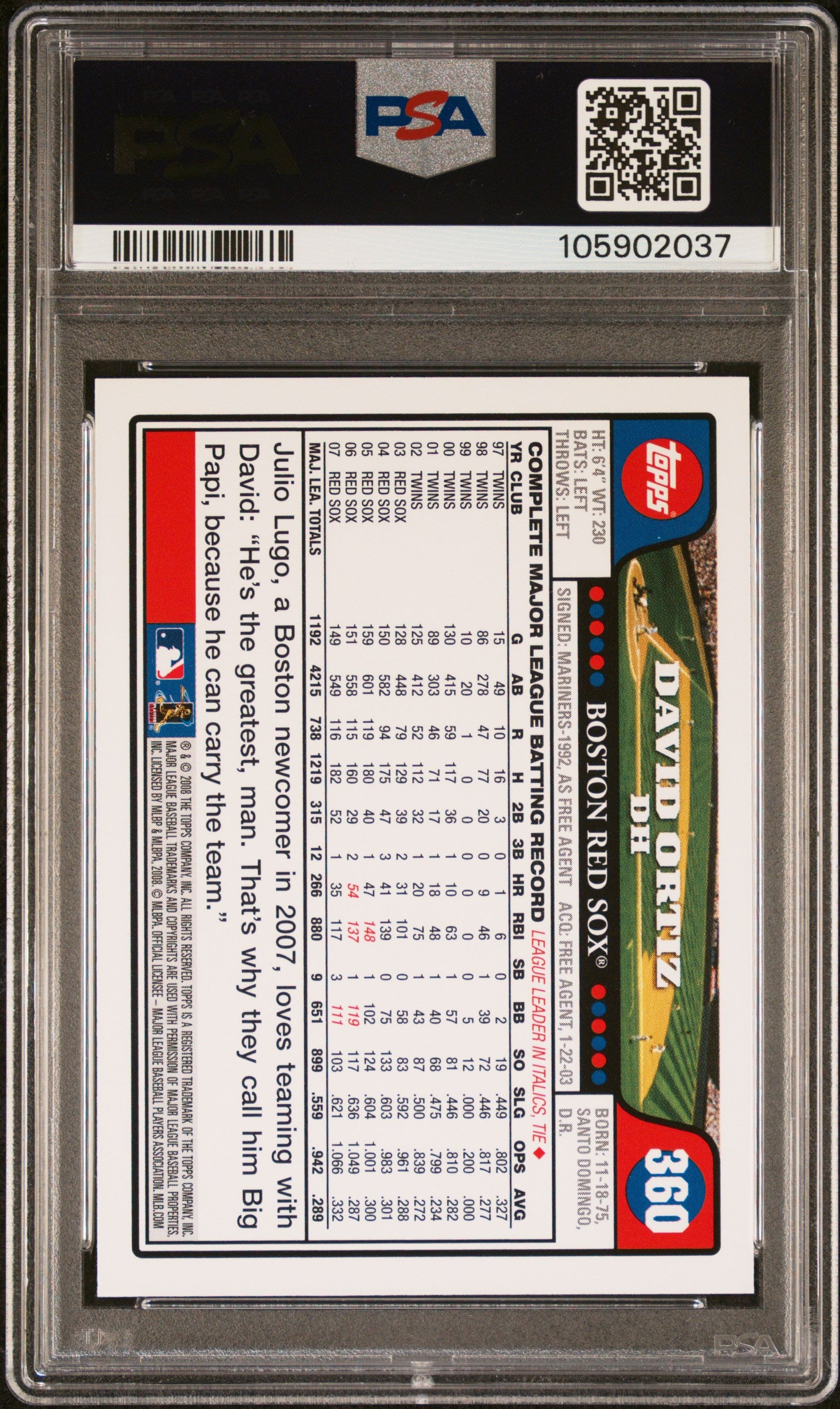2008 Topps David Ortiz #360 Graded PSA 10 Gem Mint Rare Red Sox HOF!