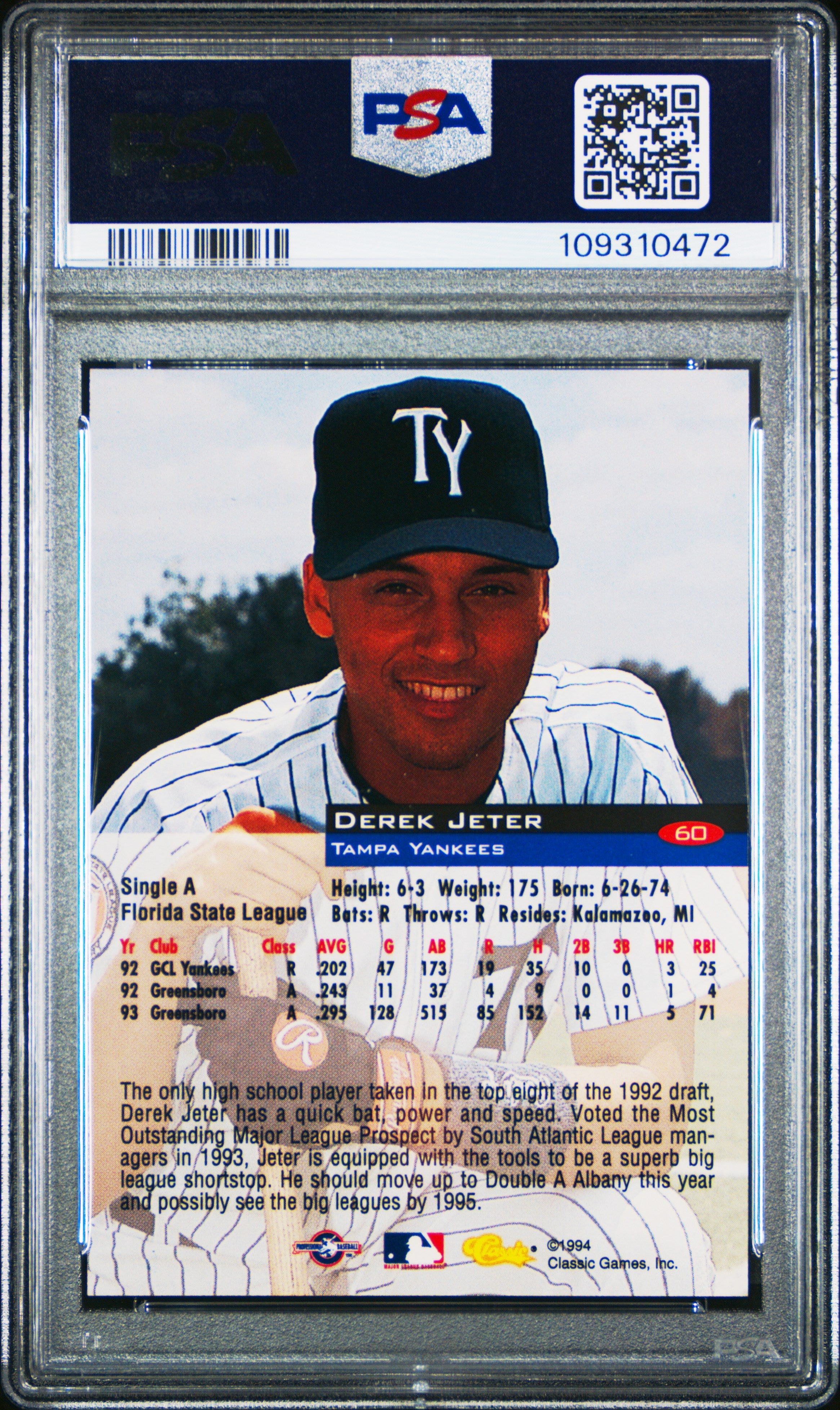 1994 CLASSIC DEREK JETER #60 MINOR LEAGUE GRADED PSA 8 NM-MT YANKEES HOF