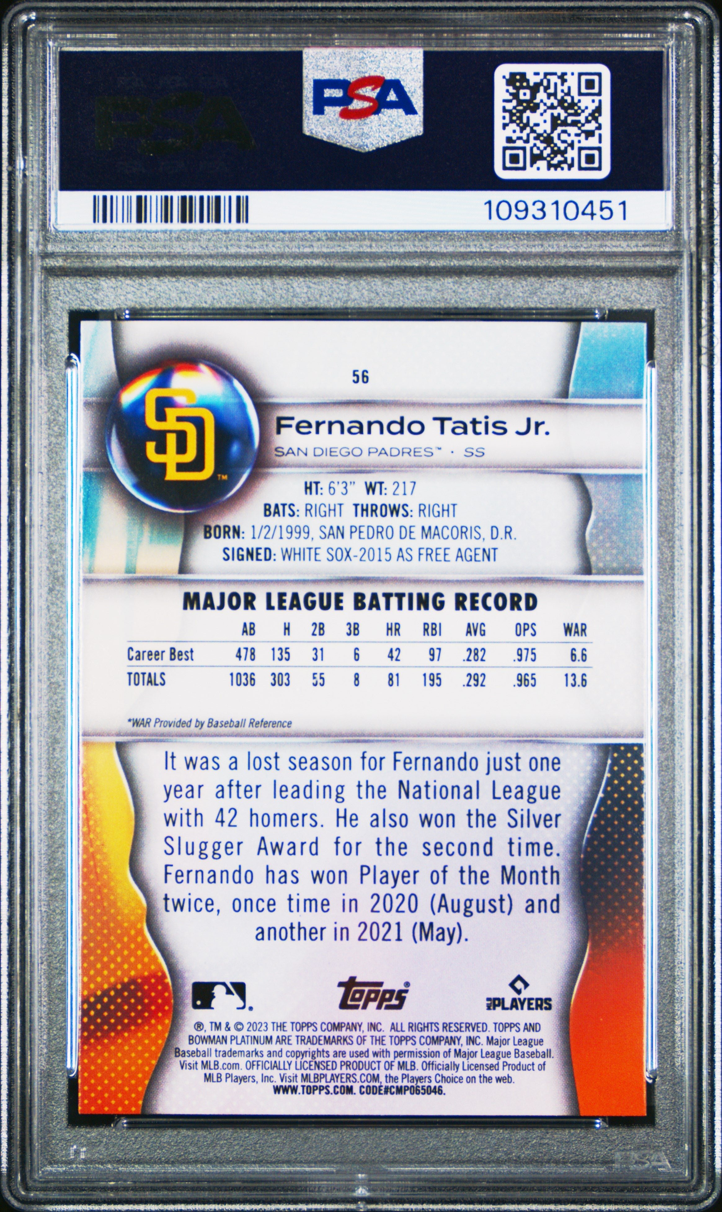 2023 BOWMAN PLATINUM FERNANDO TATIS JR. #56 ICE FOIL PARALLEL PSA 10 *POP 1*!!
