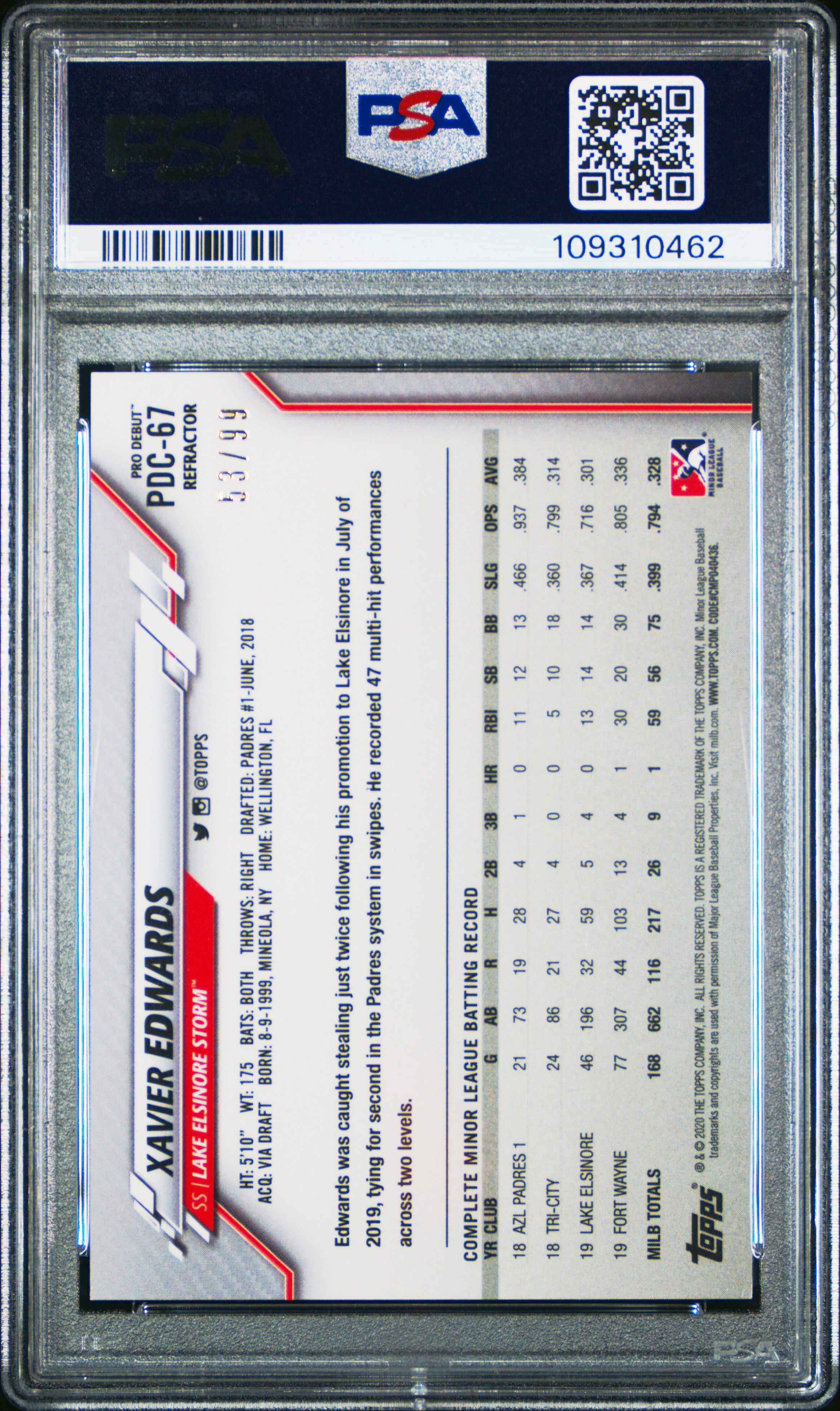 2020 TOPPS PRO DEBUT XAVIER EDWARDS CHROME REFRACTOR /99 #PDC67 PSA 10 *POP 1* GEM