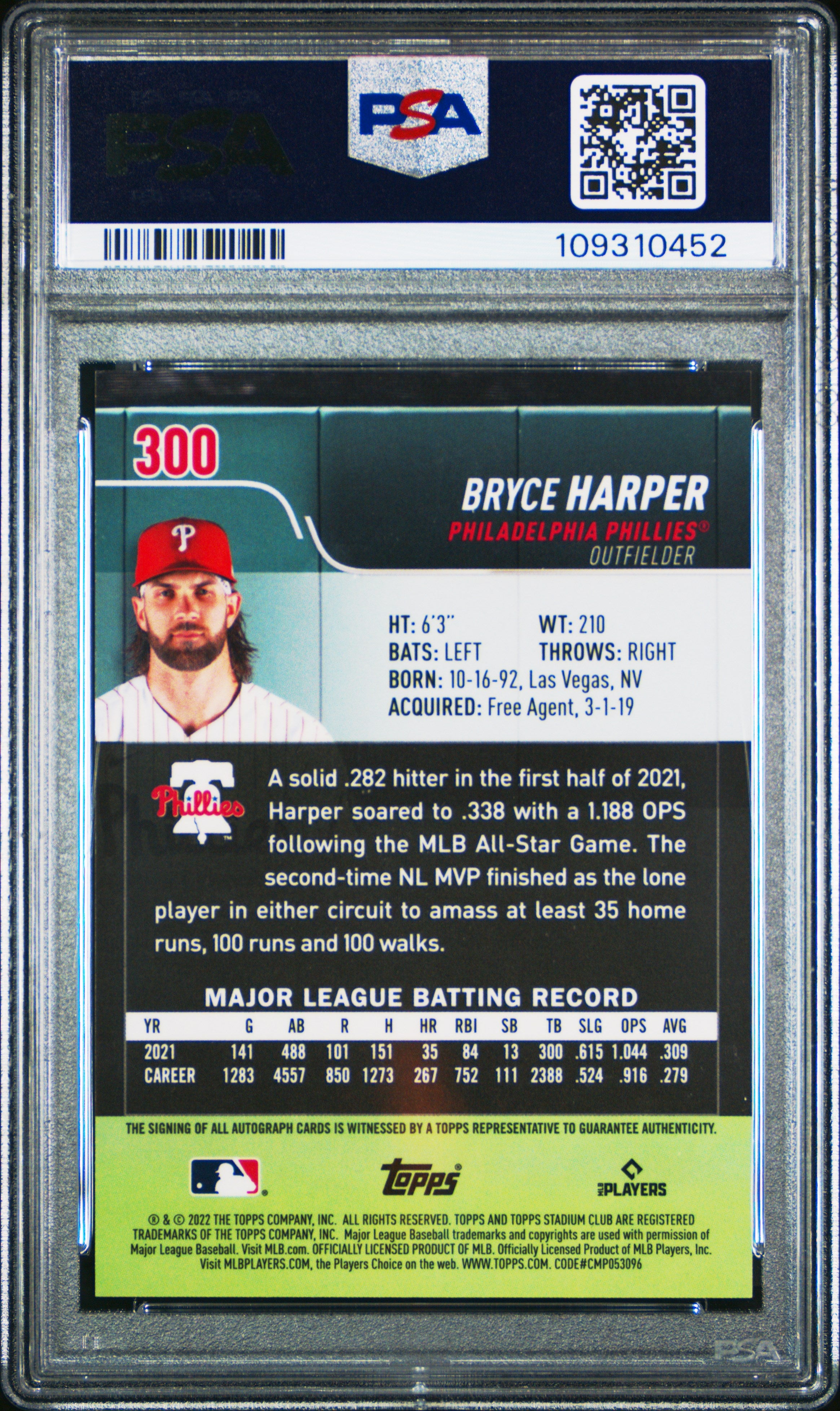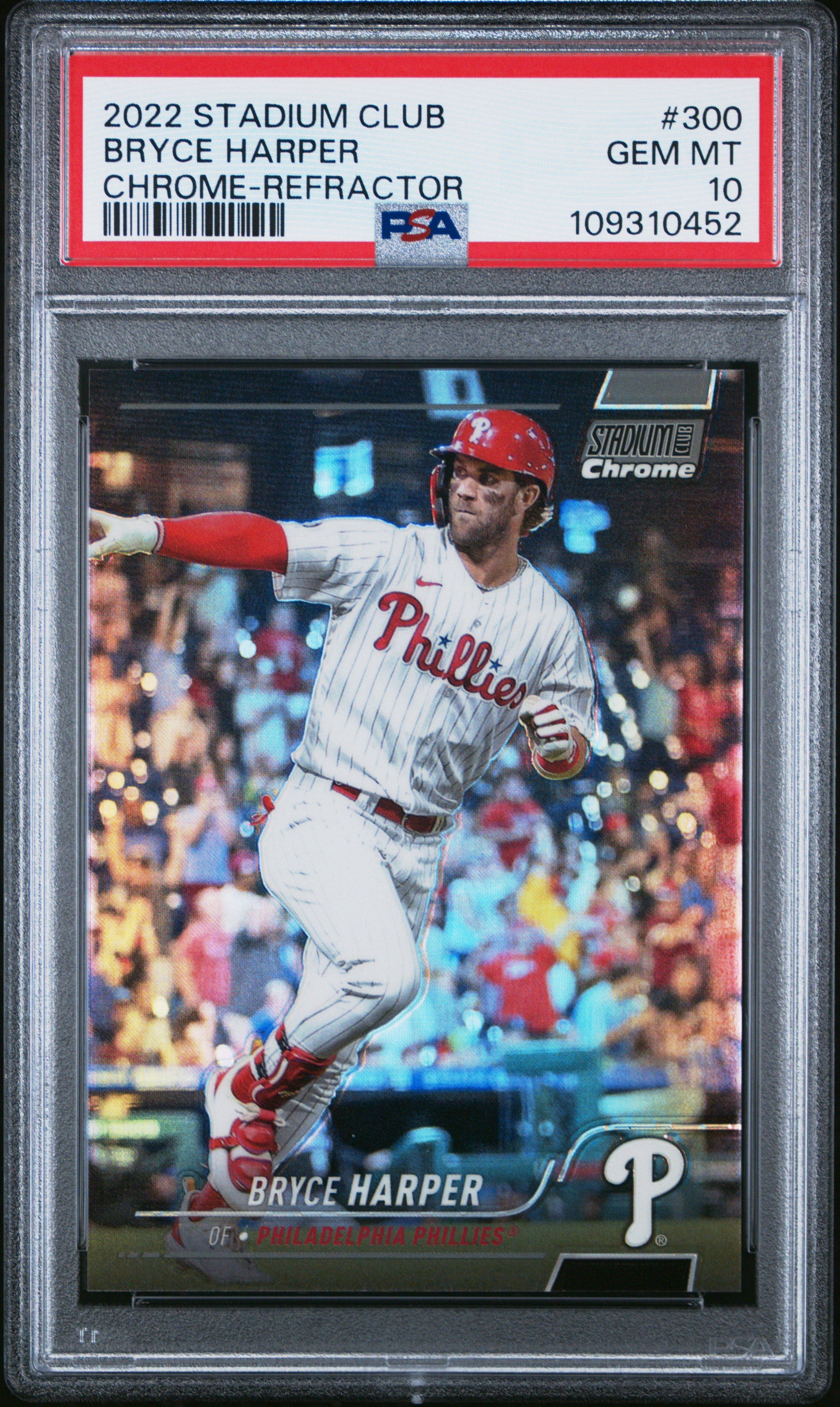 2022 TOPPS STADIUM CLUB BRYCE HARPER #300 CHROME REFRACTOR PSA 10 GEM *POP 3* RARE!
