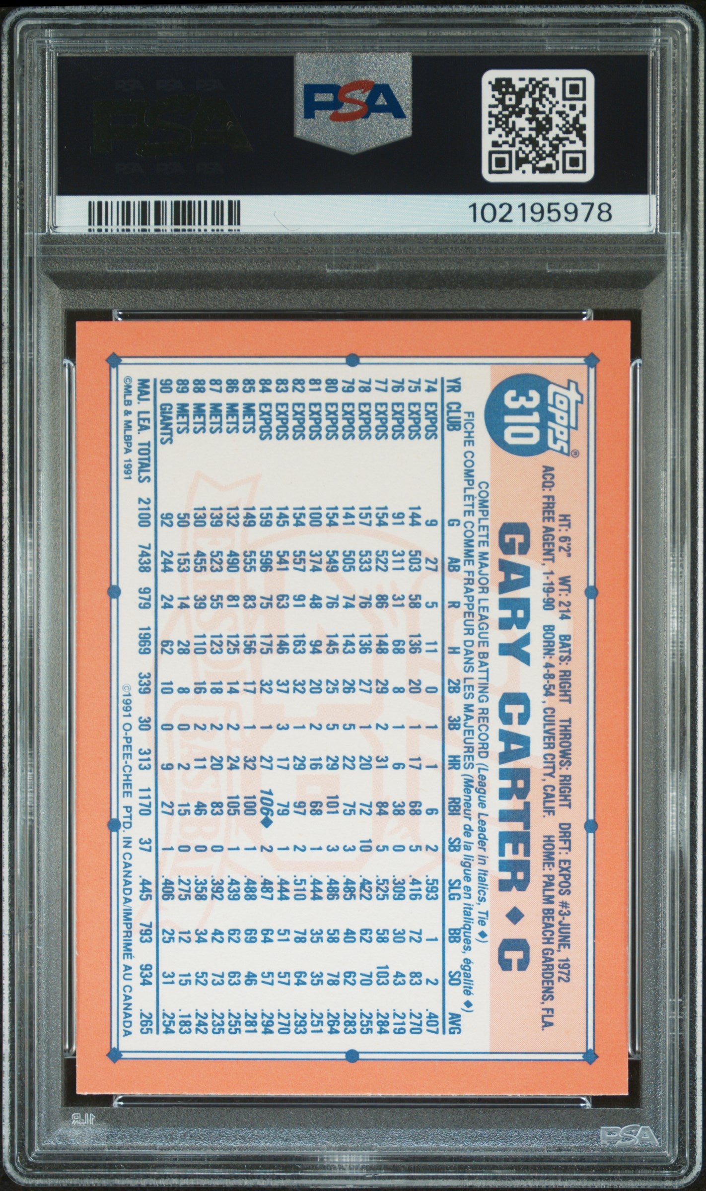 1991 O-PEE-CHEE GARY CARTER #310 GRADED PSA 10 GEM MINT RARE LOW POP