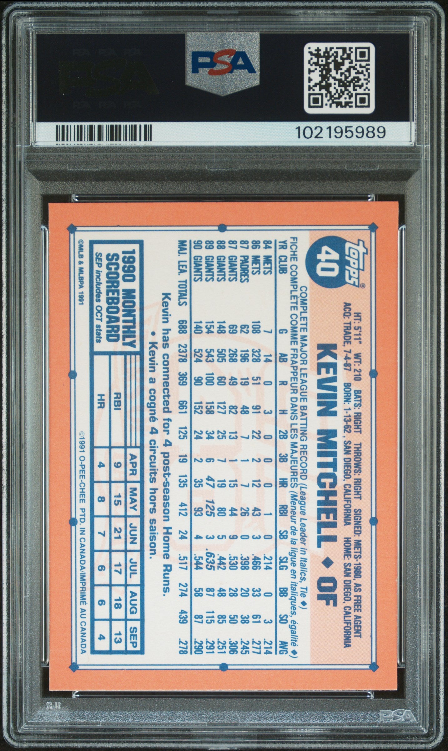 Home 1991 O-PEE-CHEE KEVIN MITCHELL #40 GRADED PSA 10 GEM MINT GIANTS **POP 1**