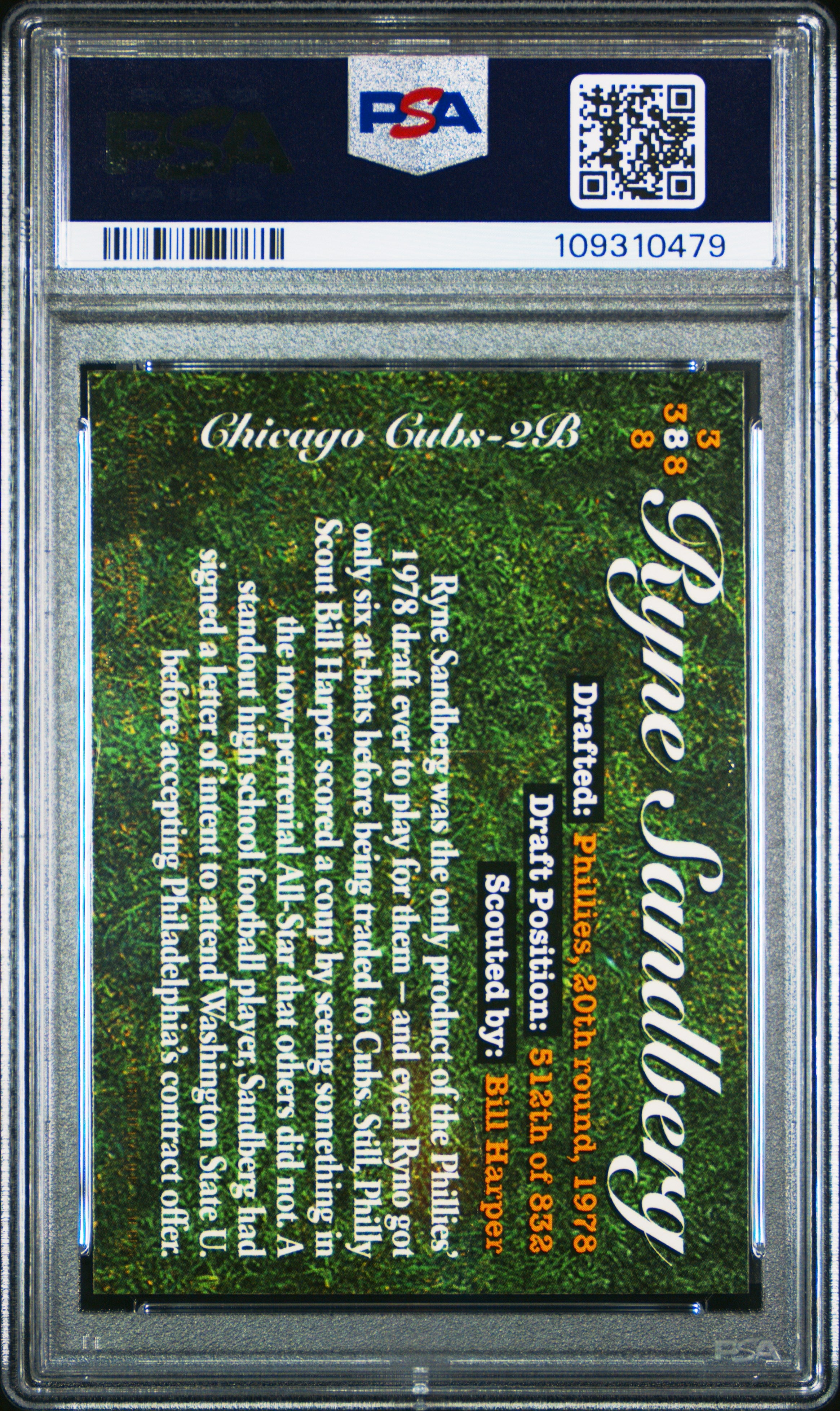 A beautiful and sharp PSA 8 foil card of legendary Chicago Cubs Hall of Famer Ryne Sandberg!