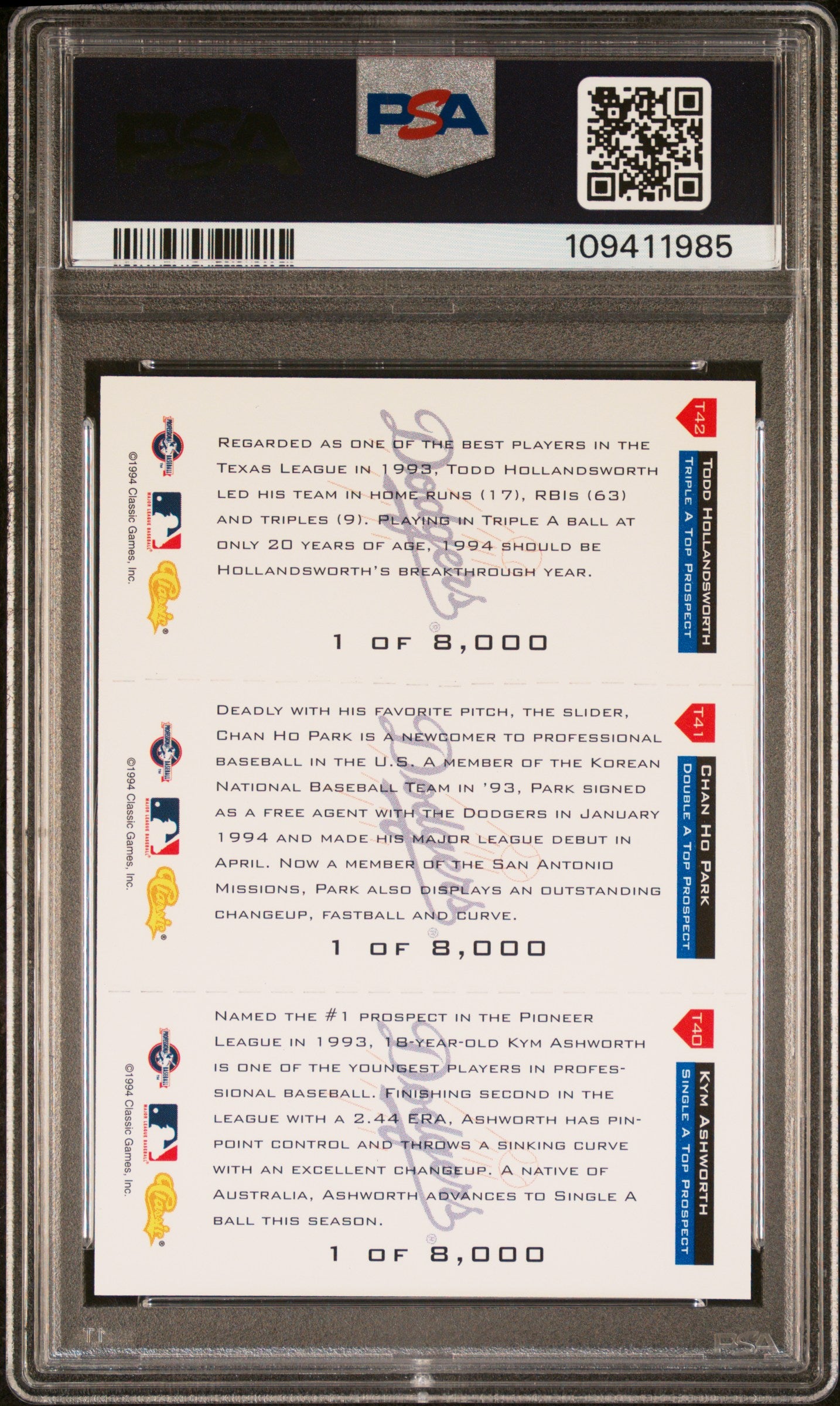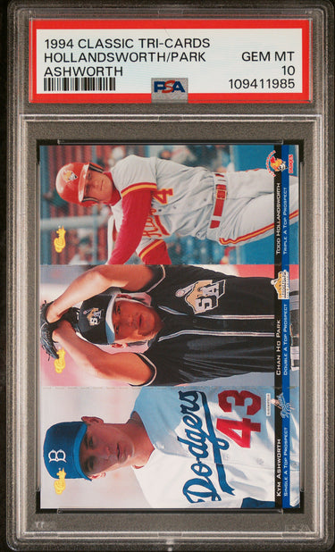 A beautiful and super sharp PSA 10 minor league rookie card of Korean pitching legend Chan Ho Park! (Also featuring Todd Hollandsworth!) This is one of the rarest Park rookie cards you'll find - these 1994 Classic Tri-Cards (featuring three players) had a run of only 8000 - impossible to find, even more impossible to grade! *** THIS IS CURRENTLY THE ONLY PSA 10 IN EXISTENCE - a "POP 1" UNICORN! ***