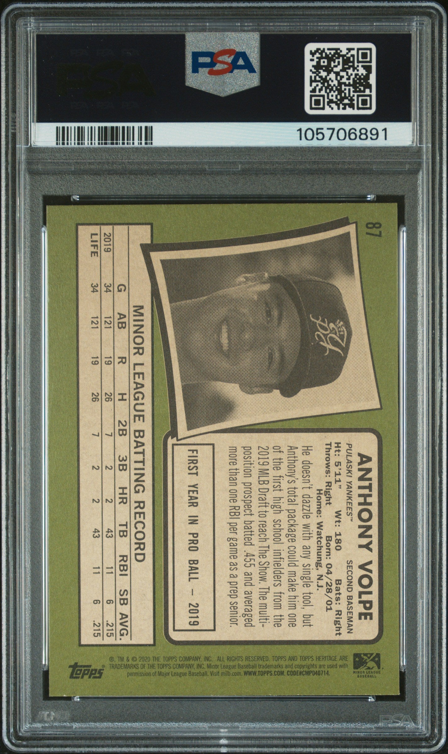 2020 TOPPS HERITAGE MINOR LEAGUE ANTHONY VOLPE #87 GRADED PSA 10 GEM MINT