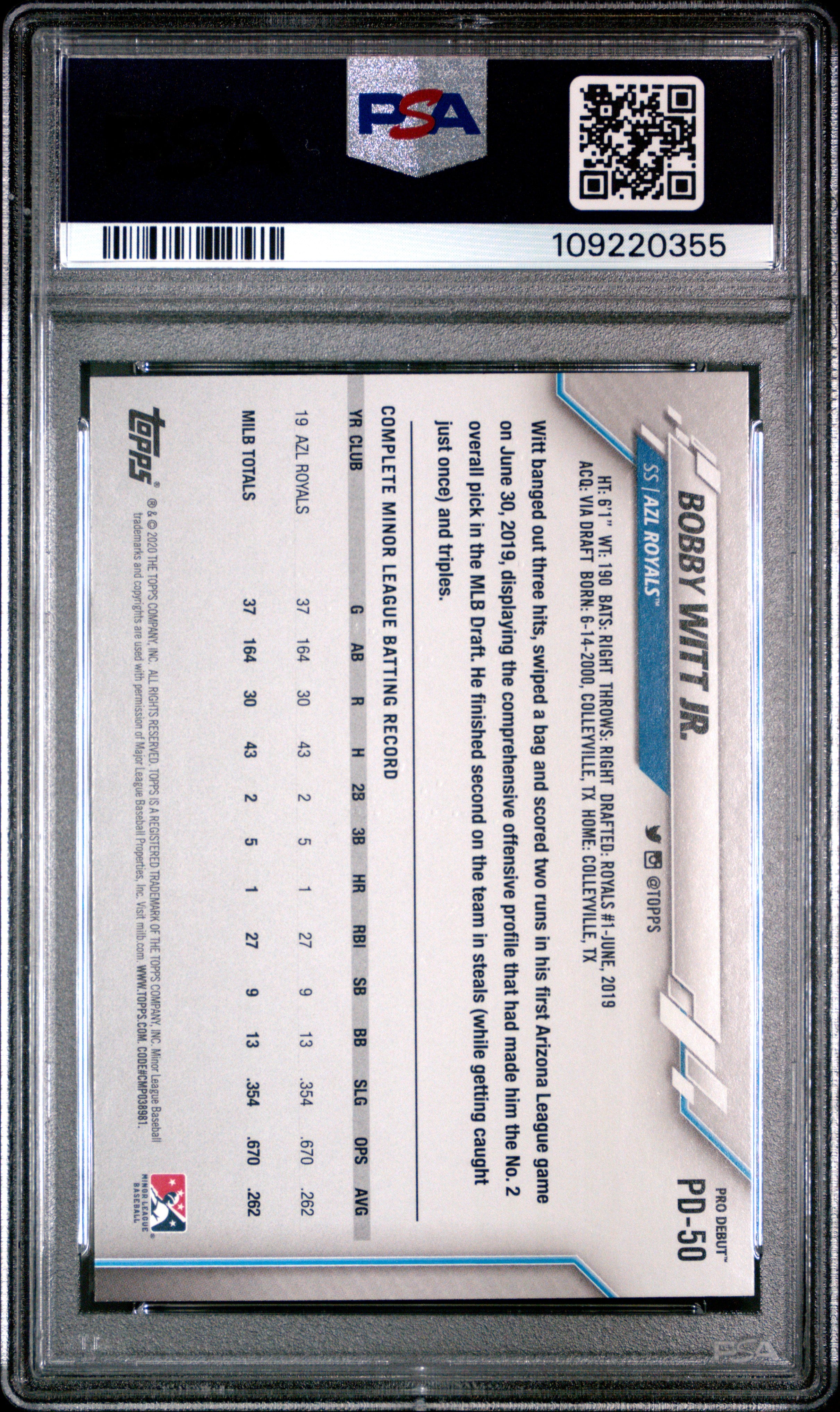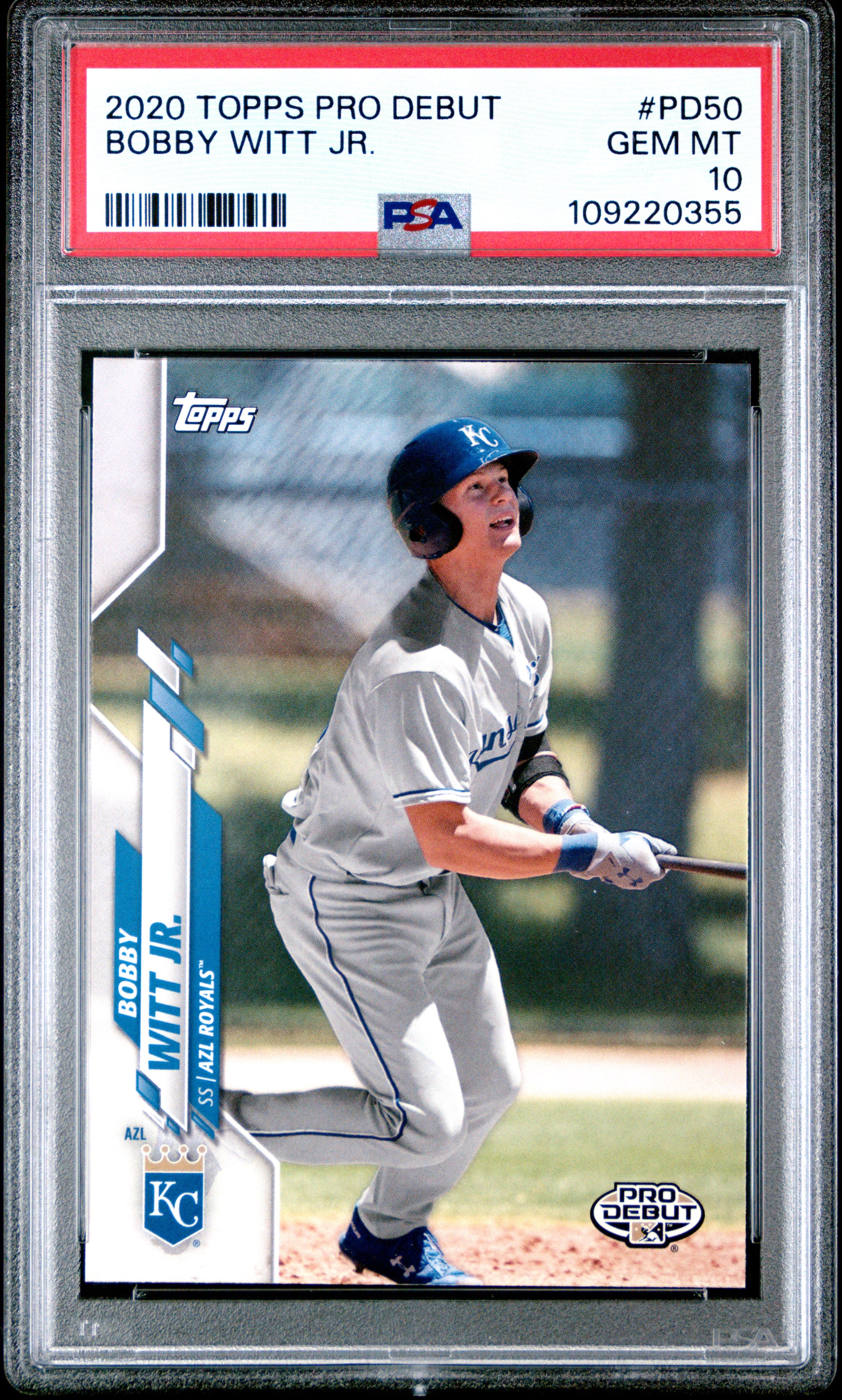 2020 TOPPS PRO DEBUT BOBBY WITT JR. #PD50 GRADED PSA 10 GEM MINT ROYALS SHARP!