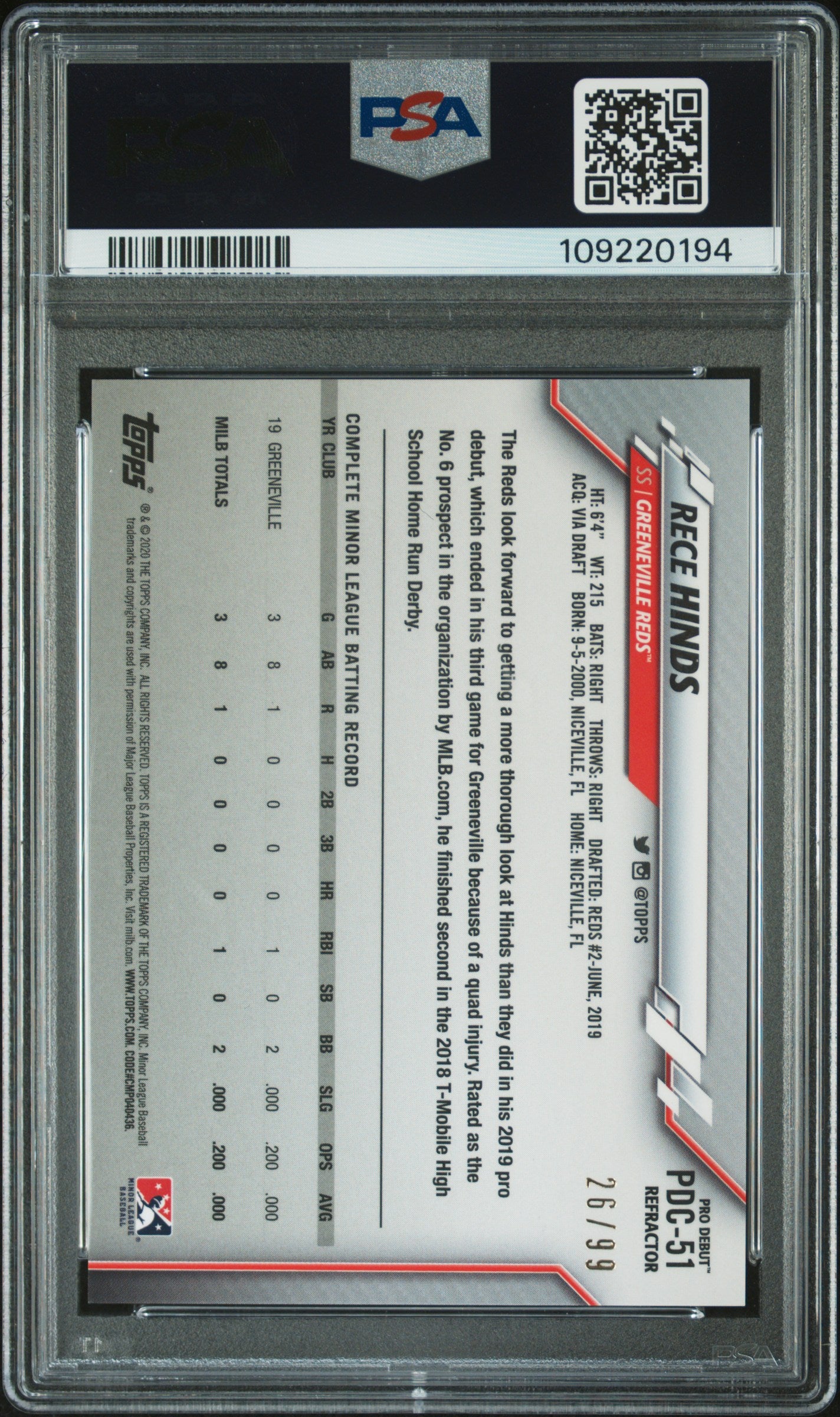 2020 TOPPS PRO DEBUT RECE HINDS #PDC51 CHROME REFRACTOR /99 PSA 10 GEM MINT POP2 GEM
