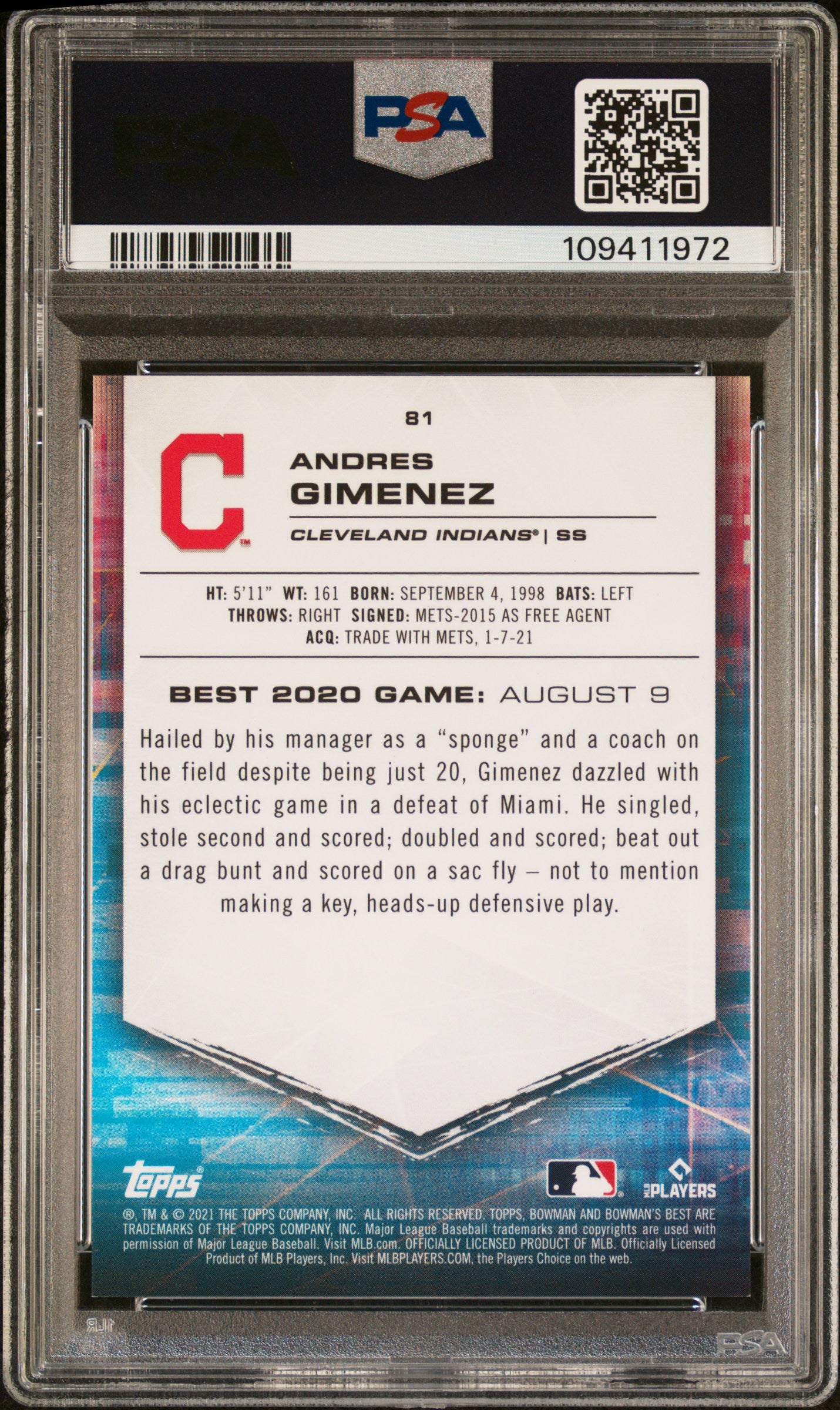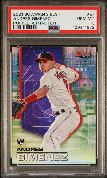 2021 BOWMAN'S BEST ANDRES GIMENEZ #81 PURPLE REFRACTOR RC /250 PSA 10 GEM POP2 RARE!