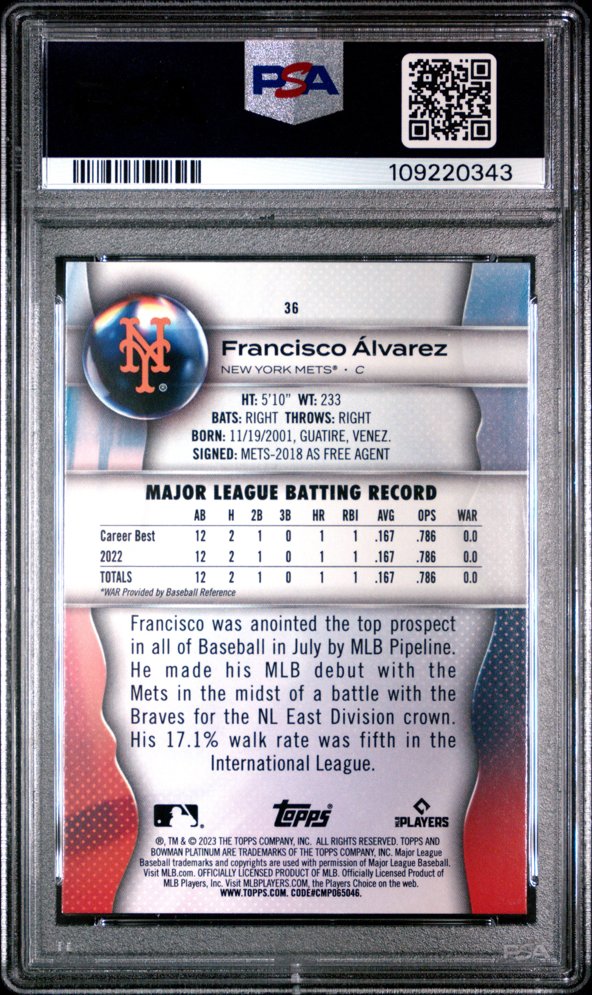 Home 2023 BOWMAN PLATINUM FRANCISCO ALVAREZ #36 ICE FOIL ROOKIE RC PSA 9 MINT RARE POP 1