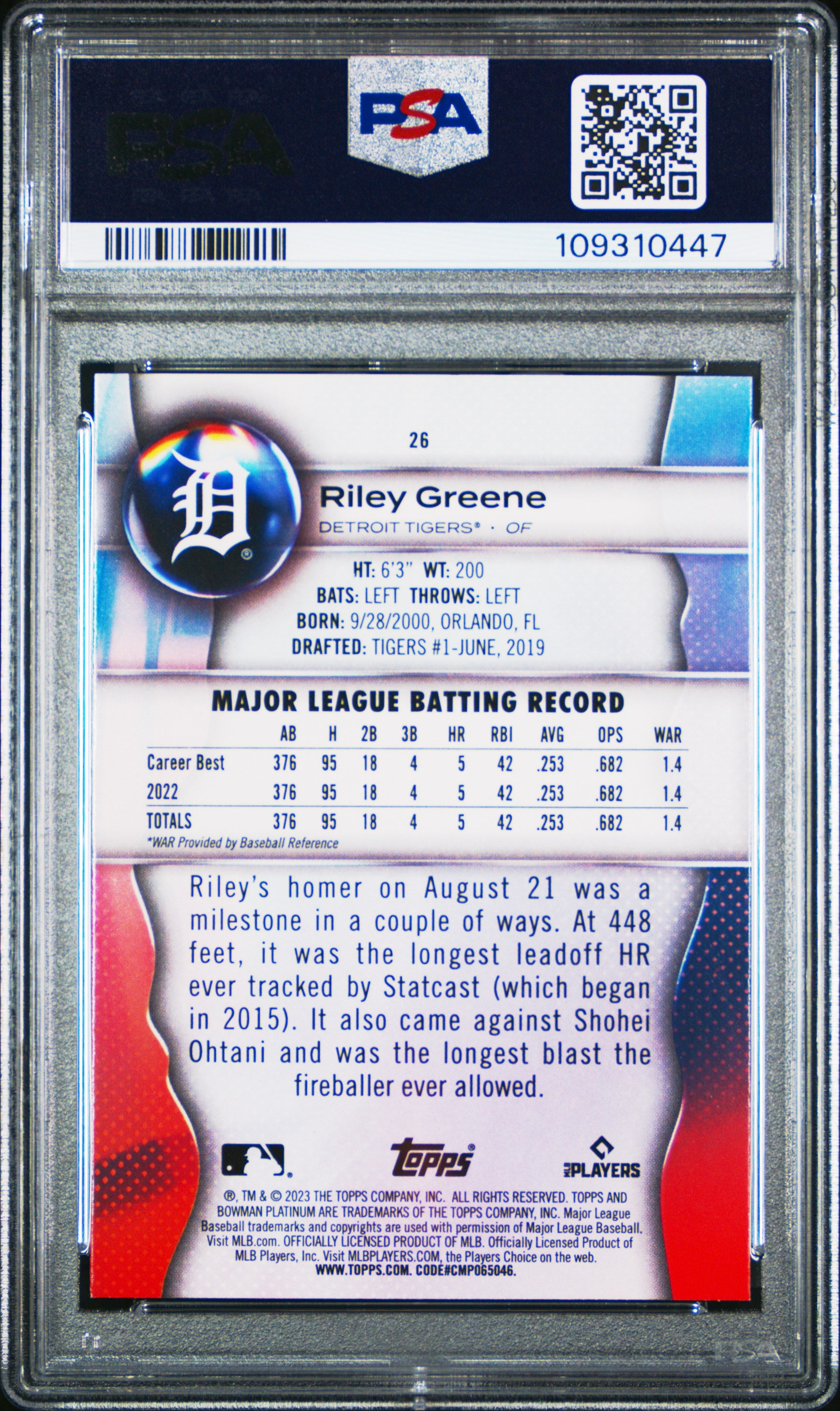 2023 BOWMAN PLATINUM RILEY GREENE #26 ICE FOIL ROOKIE RC GRADED PSA 9 MINT RARE!