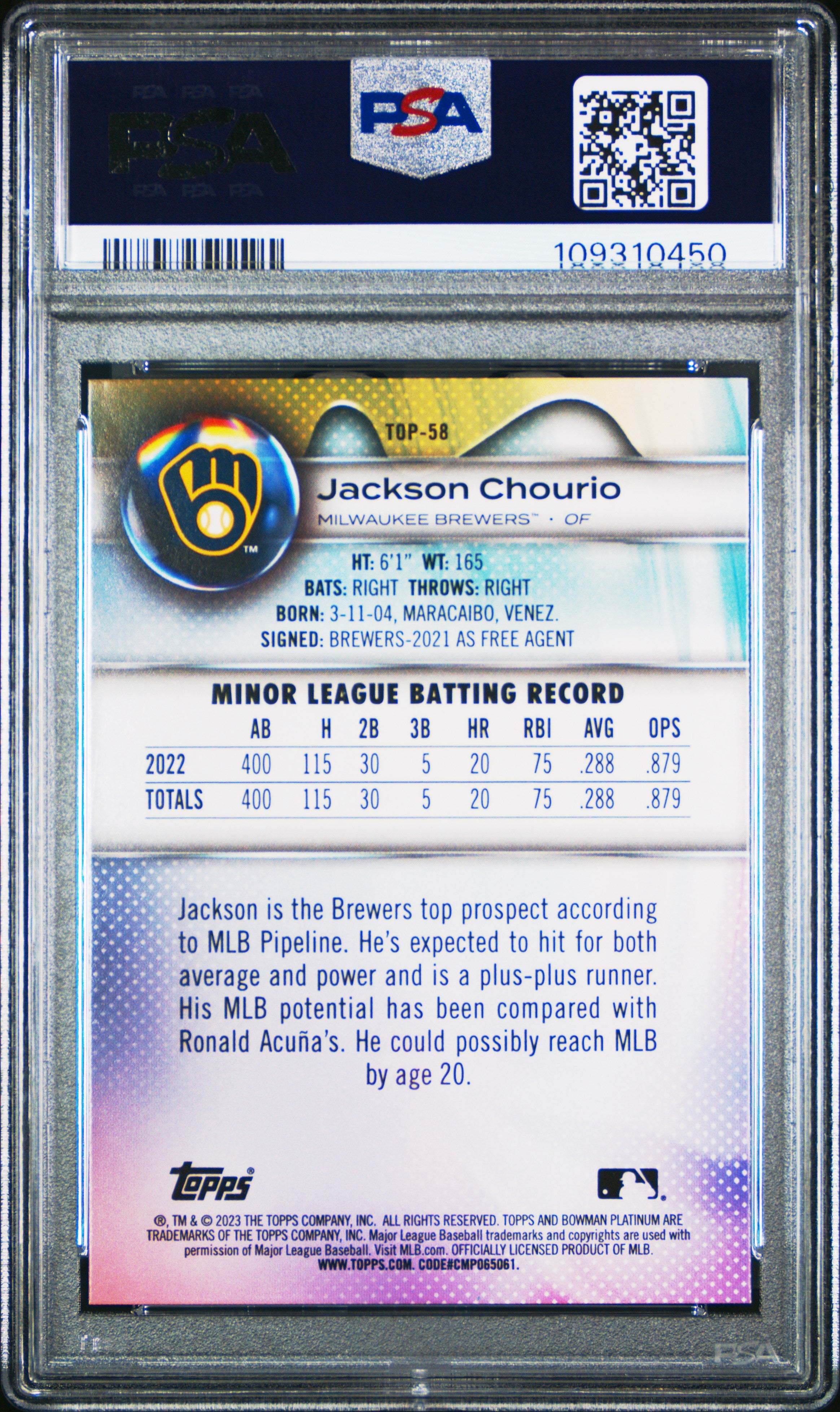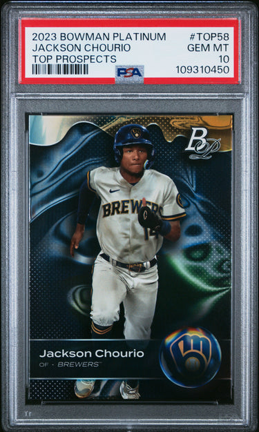 Home 2023 BOWMAN PLATINUM TOP PROSPECTS JACKSON CHOURIO #TOP58 PSA 10 GEM MINT RARE!