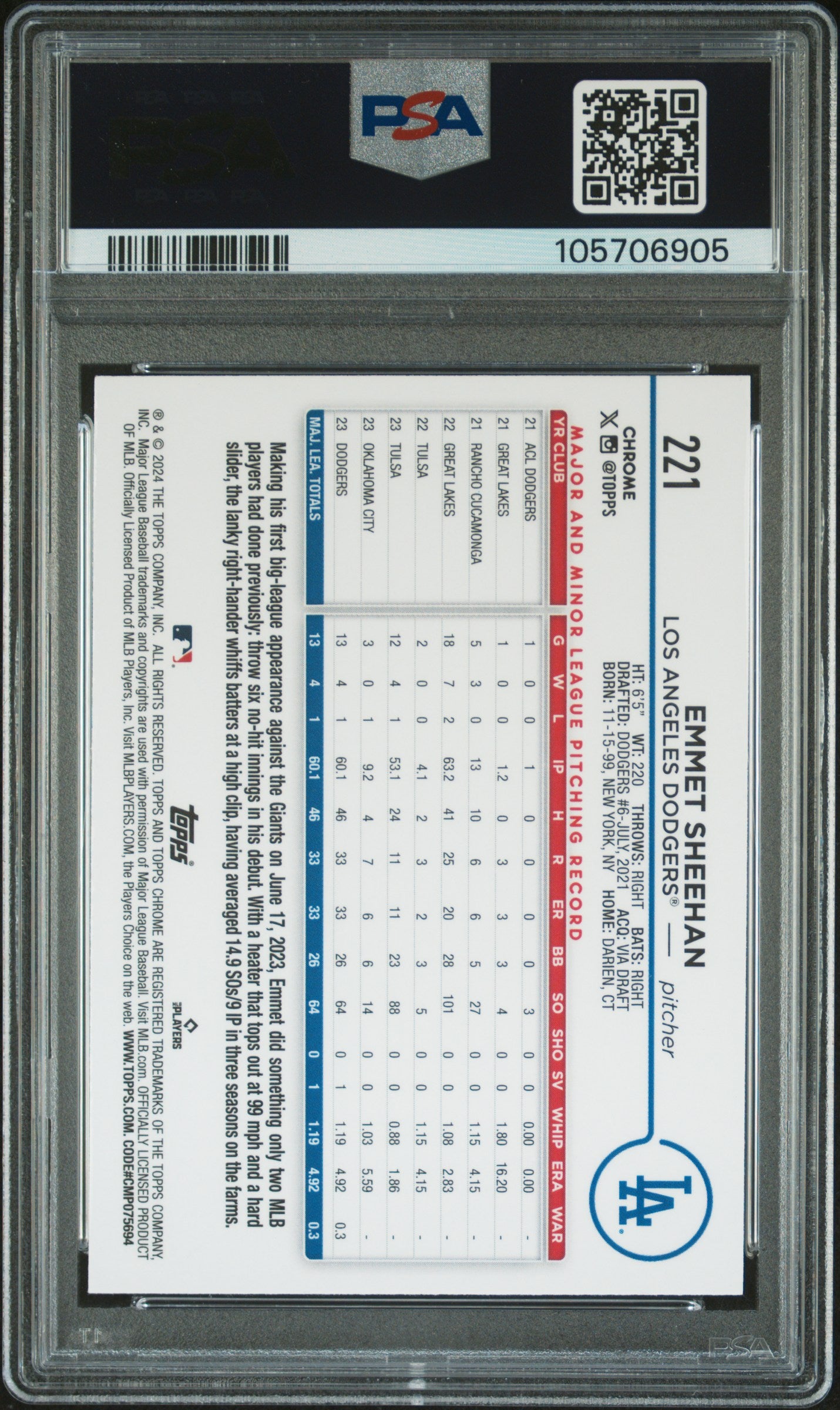 2024 TOPPS CHROME EMMET SHEEHAN #221 PRISM REFRACTOR ROOKIE RC PSA 10 GEM MINT