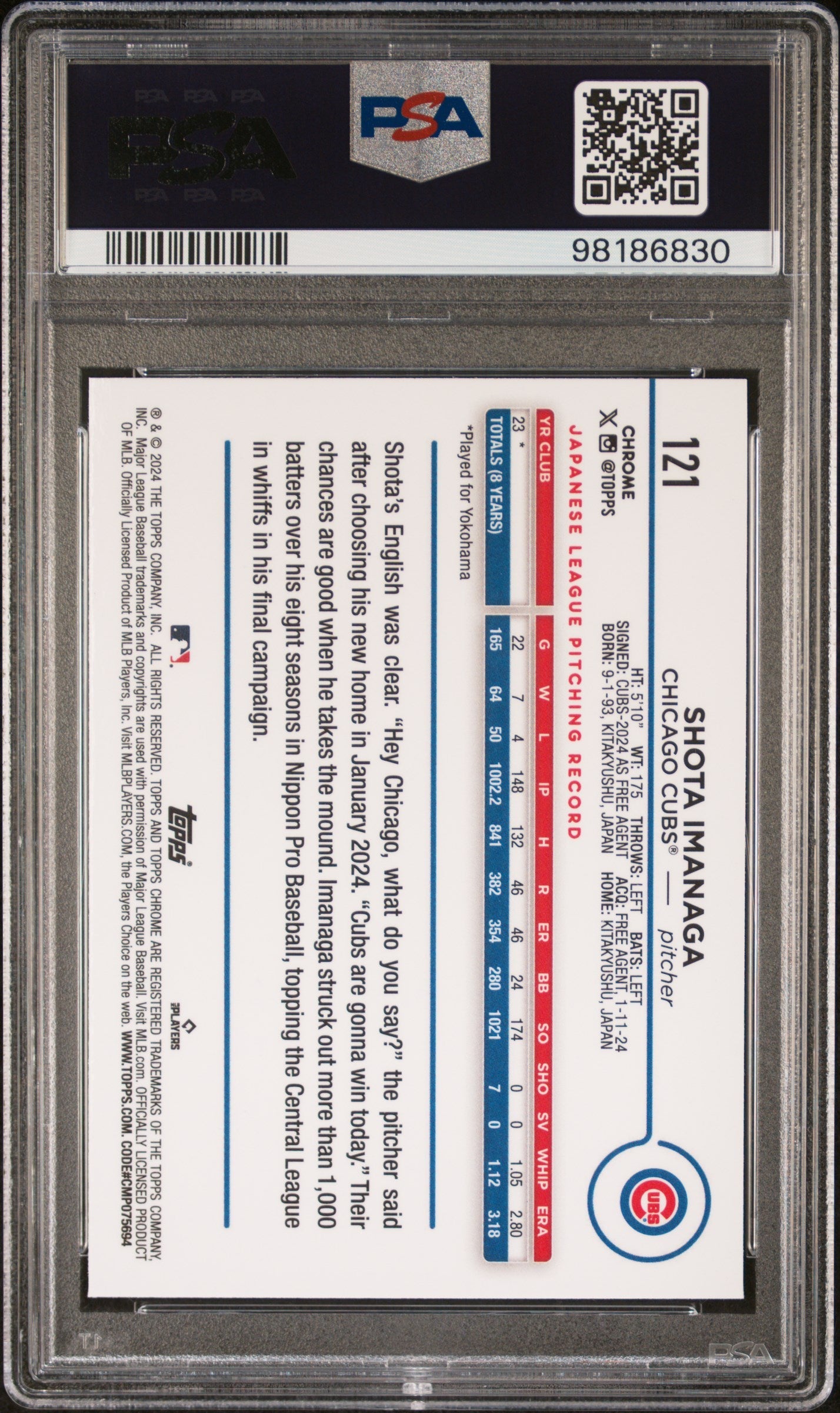 2024 TOPPS CHROME SHOTA IMANAGA #121 ROOKIE CARD RC GRADED PSA 10 GEM MINT CUBS