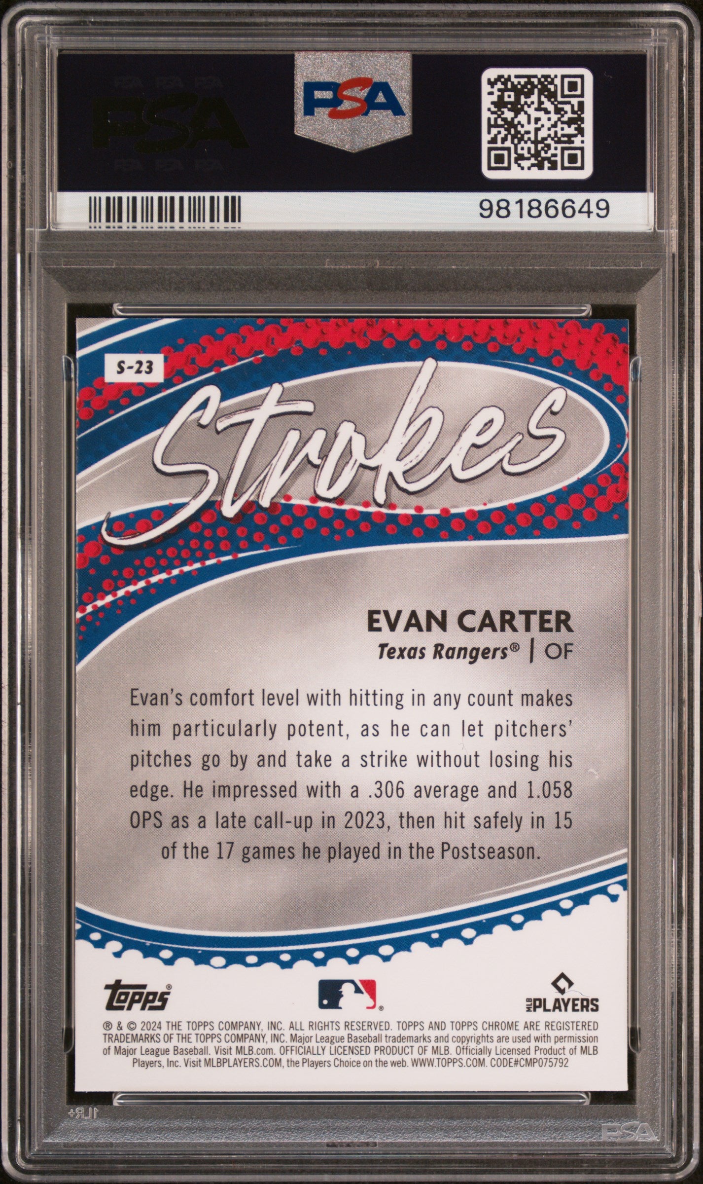 2024 TOPPS CHROME EVAN CARTER STROKES #S23 ROOKIE RC GRADED PSA 10 GEM MINT