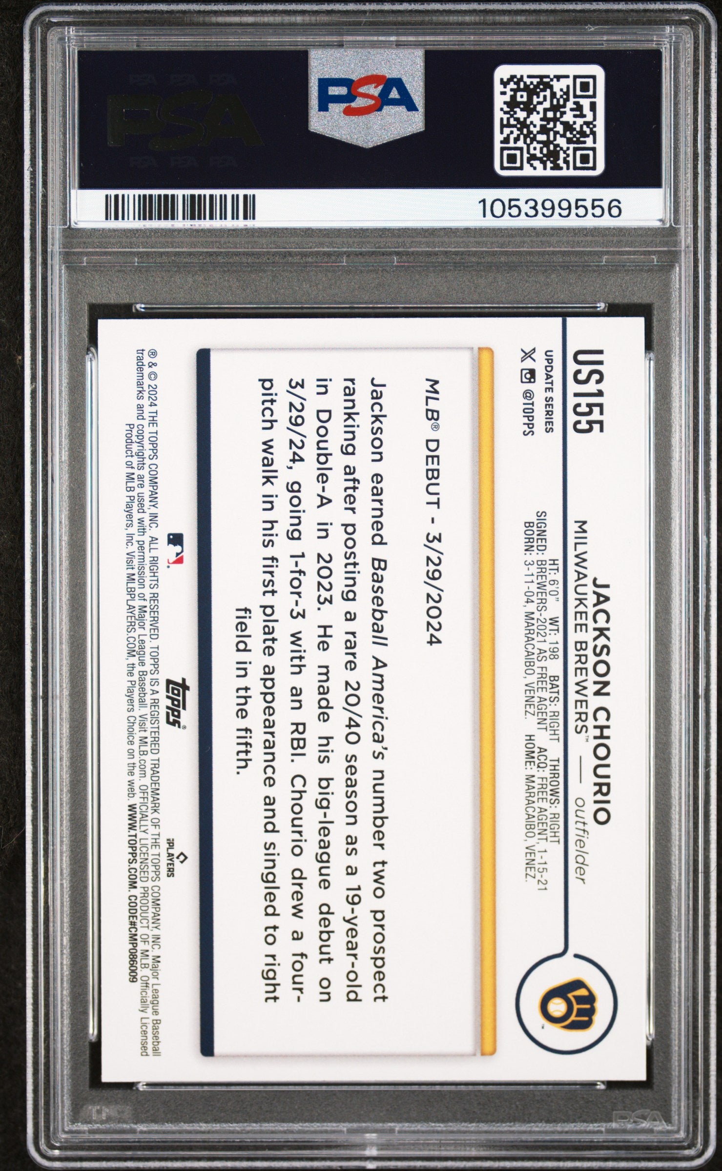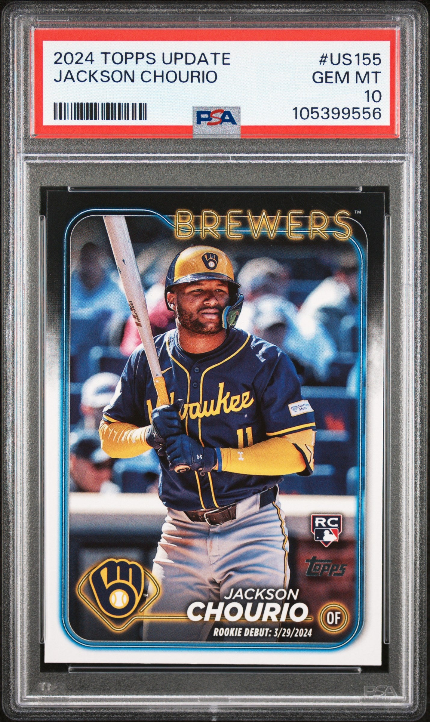 2024 TOPPS UPDATE JACKSON CHOURIO #US155 ROOKIE DEBUT RC GRADED PSA 10 GEM MINT