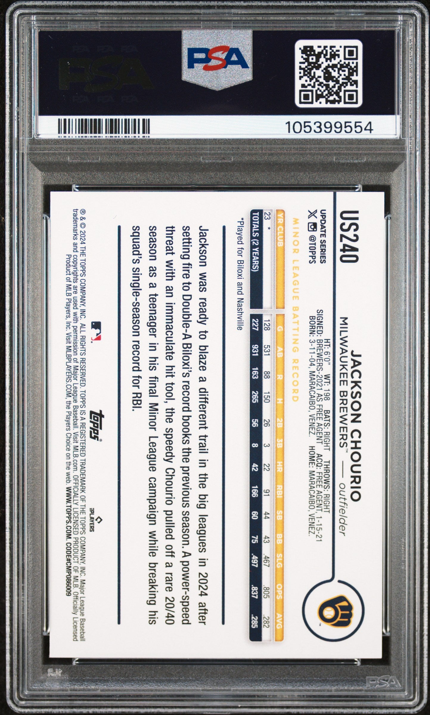 2024 TOPPS UPDATE JACKSON CHOURIO #US240 ROOKIE CARD RC GRADED PSA 10 GEM MINT